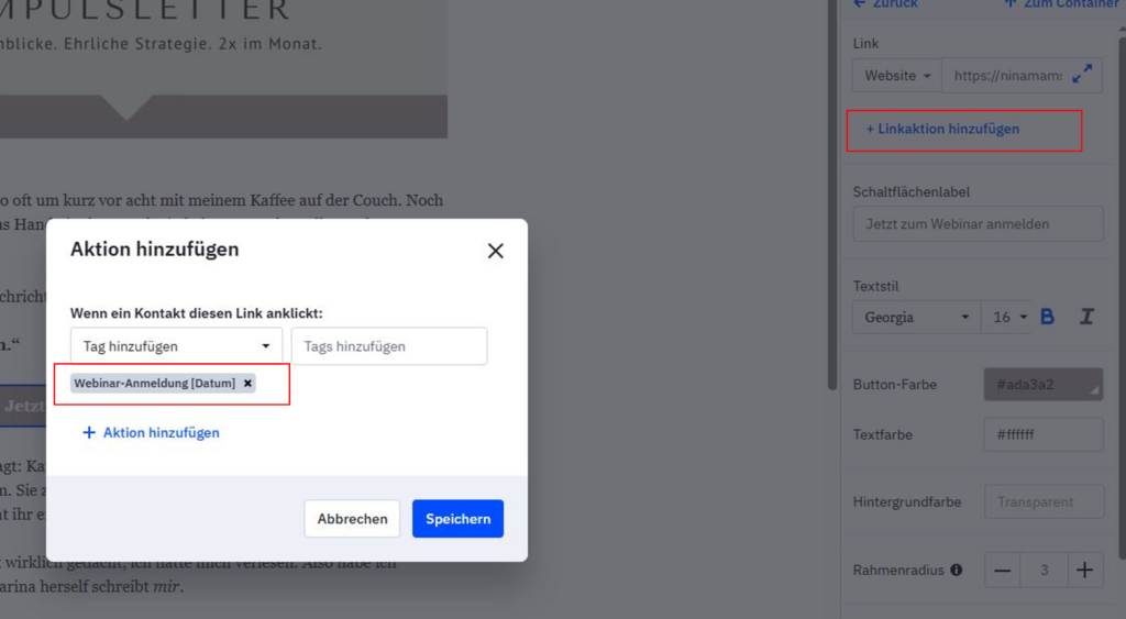 Link-Aktion einrichten: Tag beim Klick vergeben
